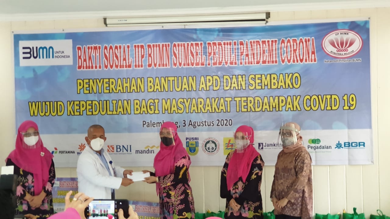 Sebagai wujud kepedulian terhadap masyarakat terdampak wabah Covid-19 di Kota Palembang, Ikatan Istri Pimpinan (IIP) BUMN Sumatera Selatan memberikan bantuan berupa paket sembako dan APD berupa masker, serta donasi untuk pembelian APD kepada RS Pusri Medika bertempat di Sekretariat IIP BUMN Sumsel pada tanggal 3 Agusttus 2020. Acara ini dihadiri oleh pengurus dan anggota IIP BUMN Sumsel dan penerima bantuan.