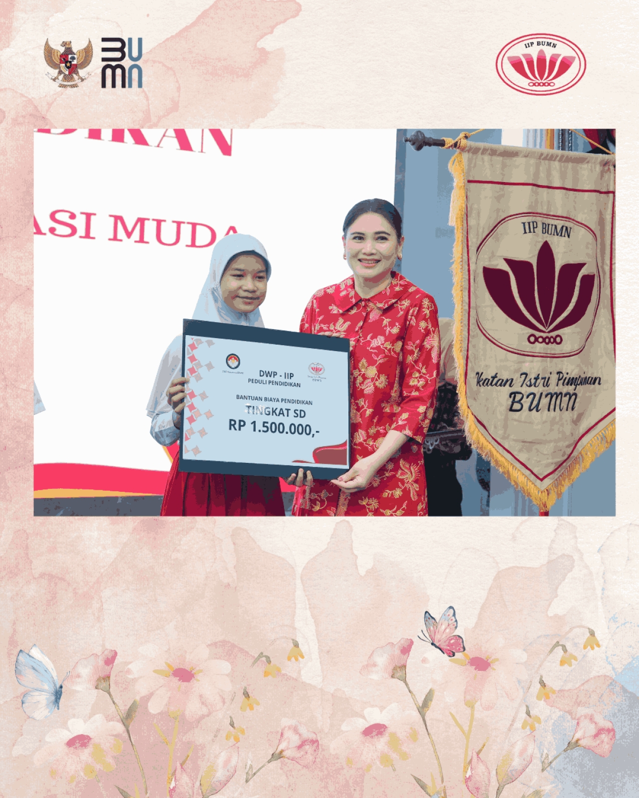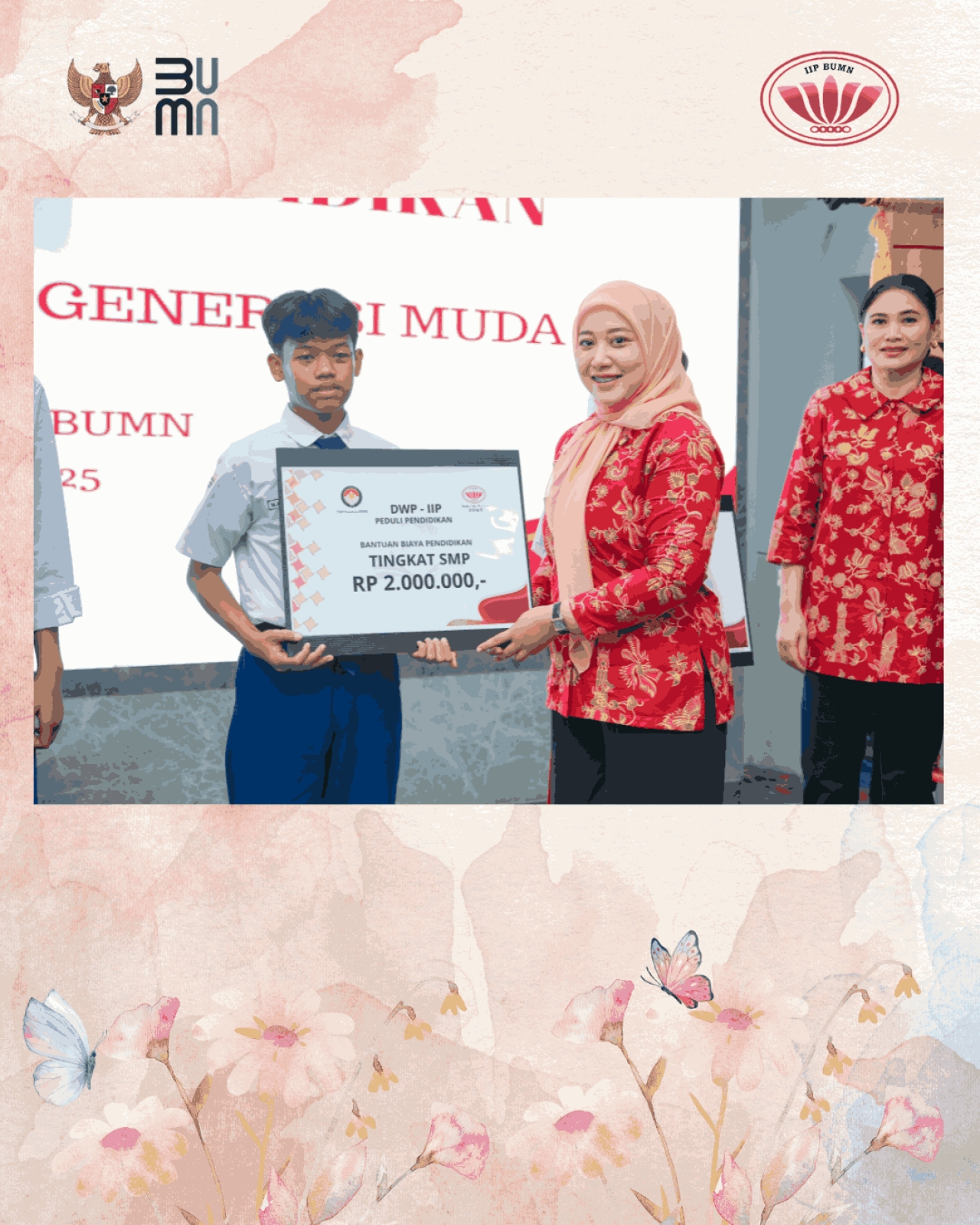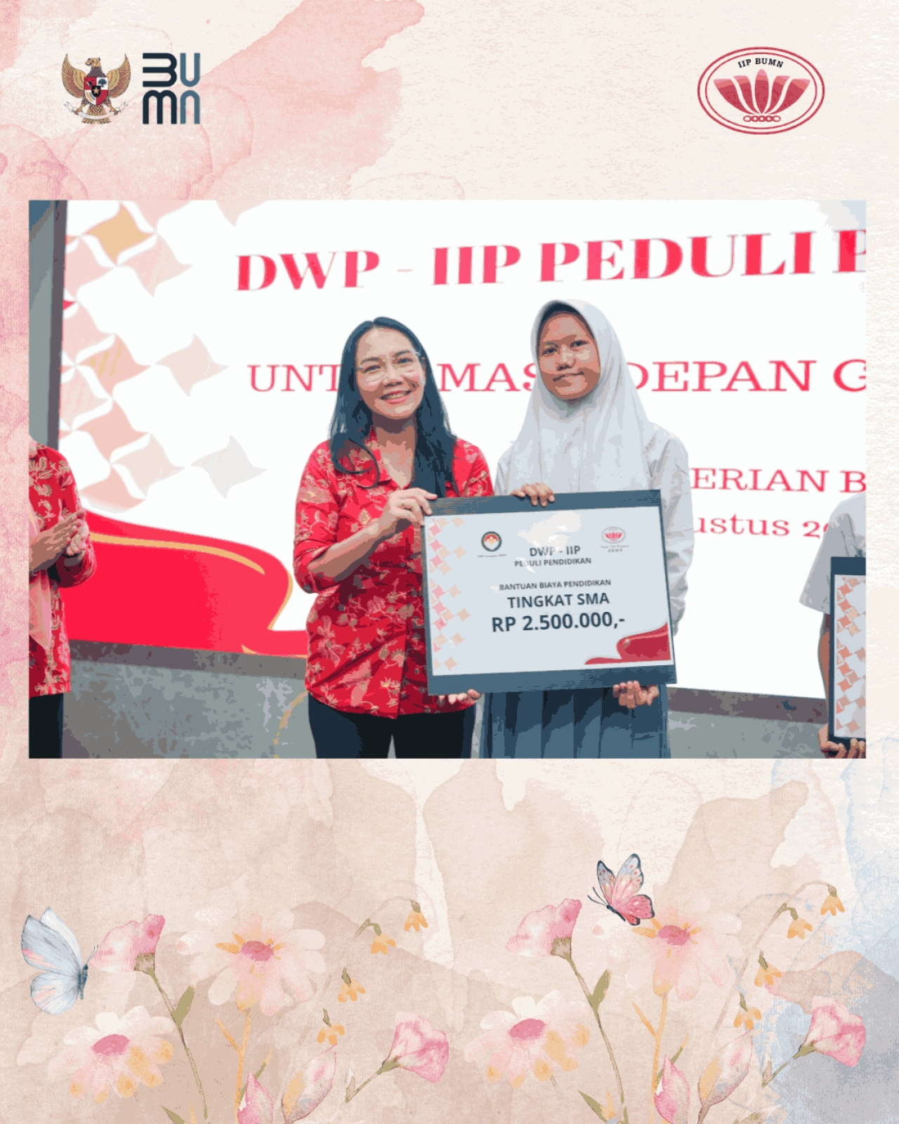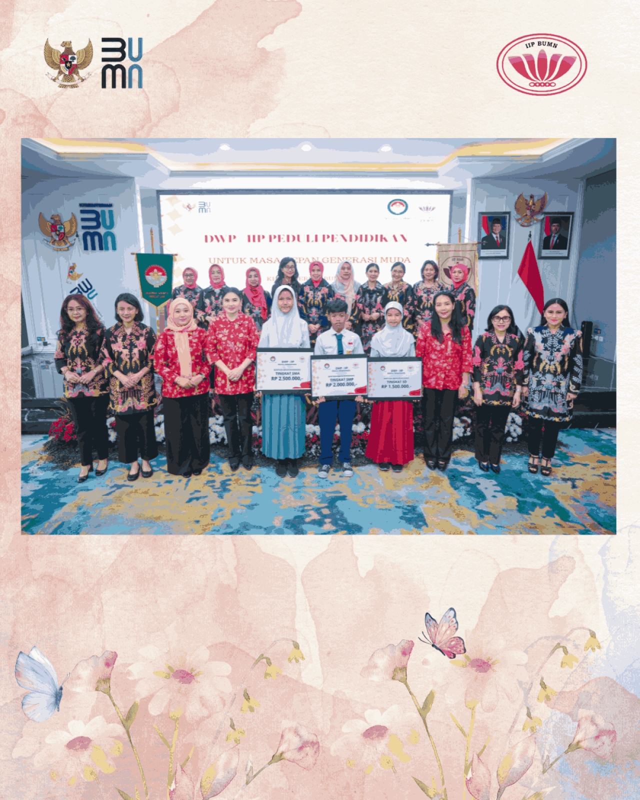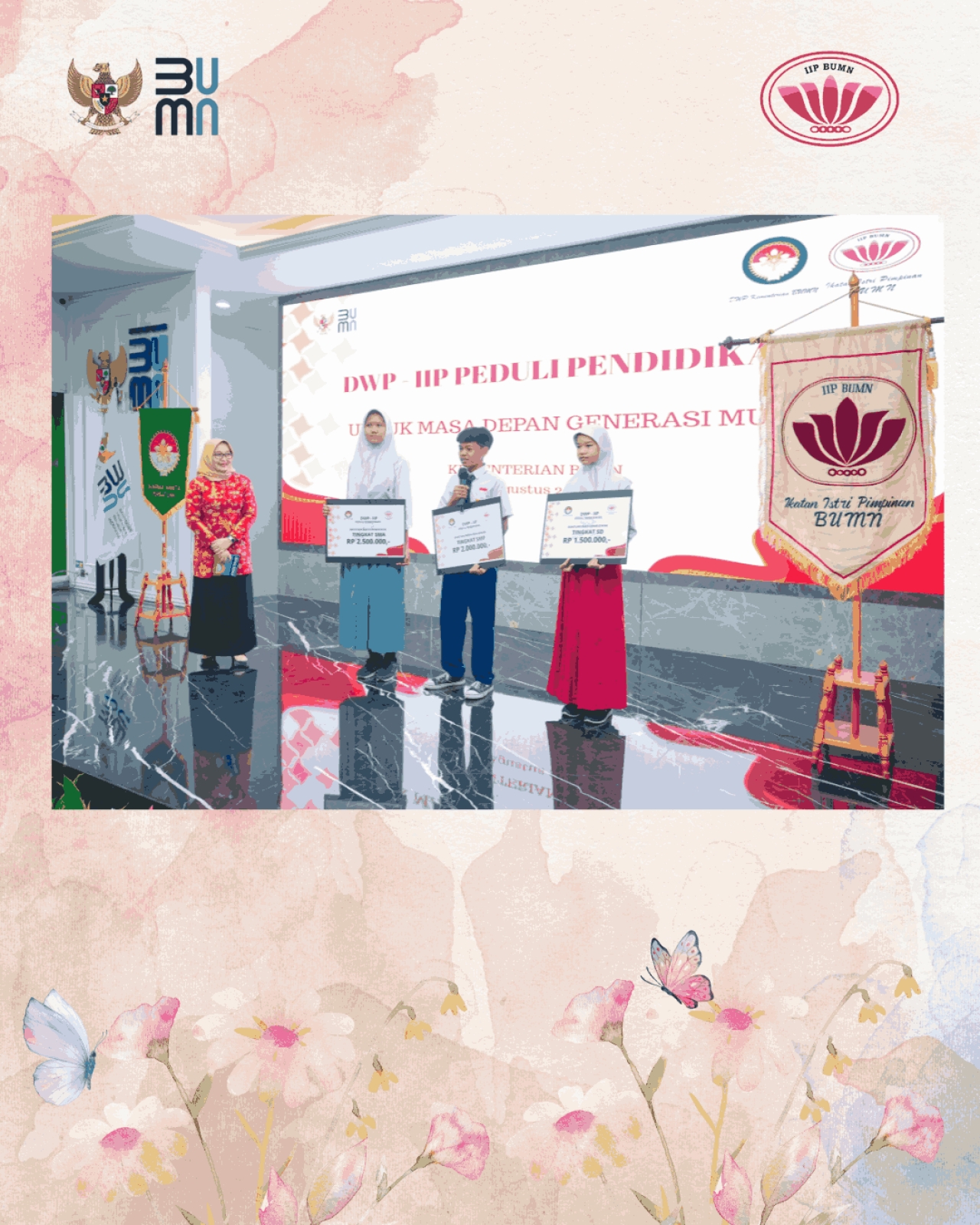 Hari Selasa, tanggal 12 Agustus 2025 telah dilaksanakan Pemberian Bantuan DWP Kementerian BUMN – IIP BUMN, kepada putra putri pegawai golongan II, outsourcing dan honorer yang bekerja di lingkungan Kementerian BUMN. Tema kegiatan kali ini “DWP – IIP Peduli Pendidikan Untuk Masa Depan Generasi Muda”.