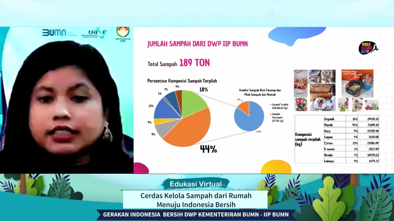 Gerakan Indonesia Bersih, DWP dan IIP Kementrian BUMN kembali mengadakan acara edukasi virtual pada hari Senin, 26 Oktober 2020. Dengan mengusung tema " Cerdas Mengelola Sampah dari Rumah Menunju Indonesia Bersih " acara diikuti oleh 1000 peserta melalu zoom meeting dan 1050 peserta mengikuti secara live di you tube.