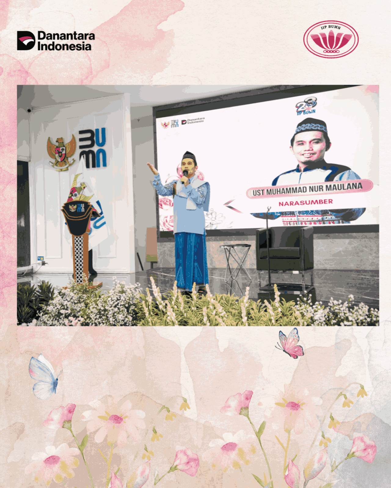 Sebagai pengisi acara adalah Ustadz Muhammad Nur Maulana. Sebelumnya pembacaan Al Quran oleh Ibu Yuliastuti Saiful Bahri dan Saritilawah Ibu Fitri Mega Satria. Tema tausiyah adalah Menjaga Hati untuk Tetap Bersyukur Atas Karunia-Nya. Acara dilanjutkan dengan pemotongan tumpeng oleh Ibu Ketua Umum IIP BUMN yang kemudian diserahkan kepada Ibu Ketua Harian. Acara disisipi dengan penggalangan dana untuk korban bencana di Aceh, Sumatera Utara dan Sumatera Barat. Donasi yang diperoleh akan segera disalurkan ke daerah bencana. Semoga memberi manfaat bagi yang menerima dan berkah bagi donatur dan penerima manfaat. Aamiin aamiin.