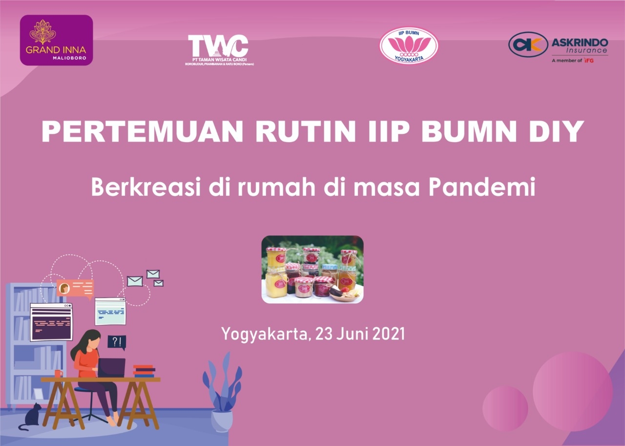 Yogyakarta, 23 Juni 2021. Pada masa Pandemi ini, IIP BUMN DIY terus dimotivasi untuk tetap produktif meskipun hanya dilakukan dari rumah. Sebagaimana disampaikan melalui pertemuan rutin IIP BUMN DIY di Grand Inna Malioboro, yang dilaksanakan secara online dan offline (dengan peserta terbatas dan menerapkan Protokol Kesehatan ketat). Dalam pertemuan tersebut, disampaikan isian tema "Berkreasi di Rumah di Masa Pandemi", dengan praktek membuat selai (jam) di dapur Grand Inna Malioboro. Dengan demikian, seluruh keluarga besar IIP BUMN DIY memiliki bekal baru di bidang pembuatan selai, dan bisa menjadi sebuah peluang usaha yang menjanjikan.