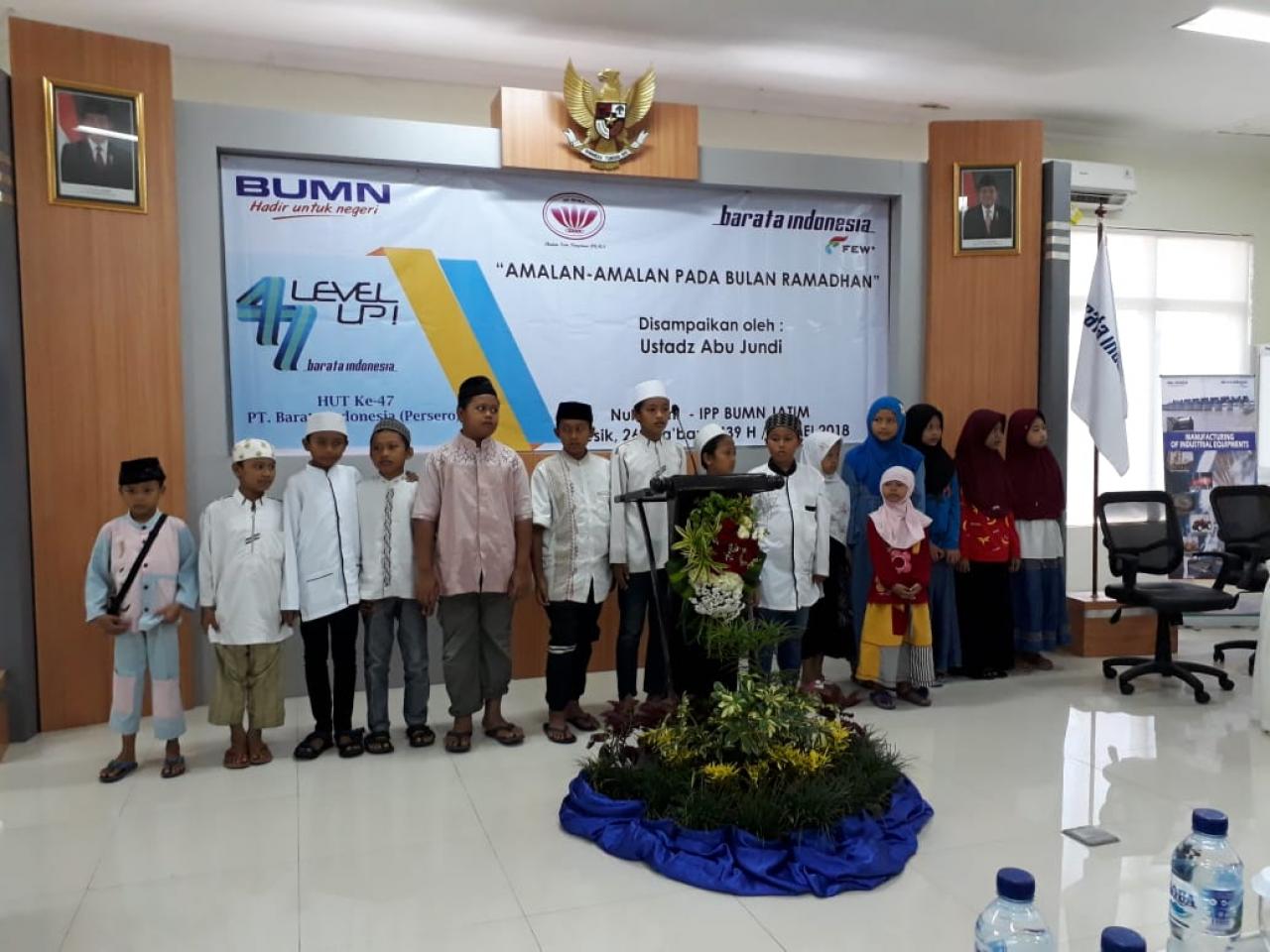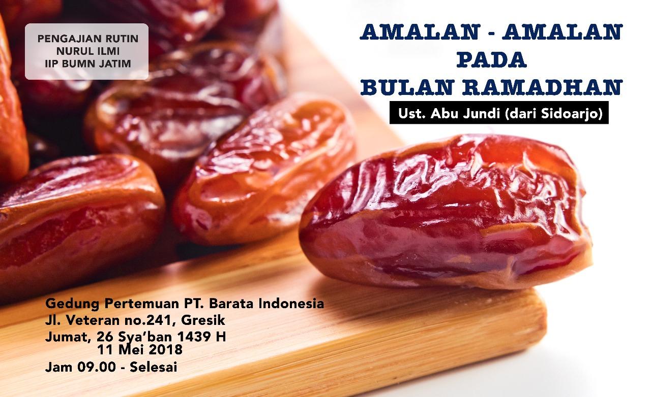 Pengajian rutin yang diadakan kelompok pengajian Nurul Ilmi - IIP BUMN Wilayah Jatim kali ini bertepatan dengan menyambut datangnya bulan Ramadhan 1439 H, bertempat di Gedung Pertemuan PT Barata Indonesia (Persero) - Gresik pada hari Jum'at tanggal 11 Mei 2018. Adapun tema yang dikaji adalah "Amalan-Amalan Pada Bulan Ramadhan" yang disampaikan oleh Ust. Abu Jundi dari Sidoarjo. Pengajian rutin ini juga dihadiri oleh yayasan panti asuhan yang sekaligus menerima sumbangan dari kelompok pengajian Nurul Ilmi - IIP BUMN Wilayah Jatim.