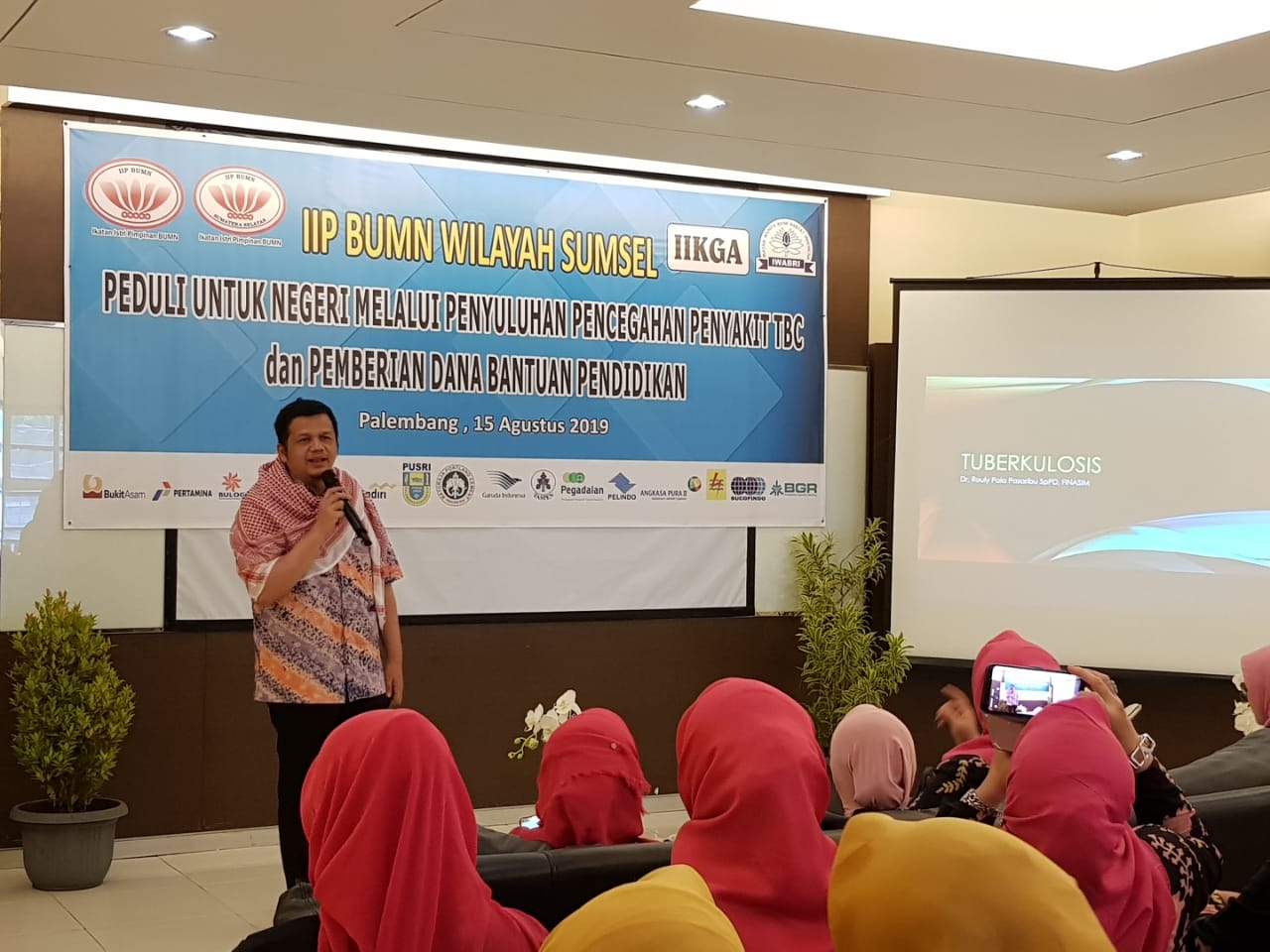 Disampaikan oleh Narasumber Penyuluhan Penyakit TBC dari Di kes Kota Palemban, mengingat 8 dari 10 orang di Indonesia merupakan sumber penularan penyakit TBC berdasarkan data dari Departemen kesehatan RI. Untuk itu narasumber, Dr. Rouly Pola Pasaribu, SpPD, Finasim menyambut baik kegiatan penyuluhan pencegahan penyakit TBC yang dilaksanakan IIP BUMN Wilayah Sumsel dan mengharapkan Istri-istri Pimpinan BUMN SeSumsel dapat memberikan sumbangsih nyata dengan mencetak poster sederhana tentang pencegahan penukaran Penyakit TBC untuk diletakan dilayanan publik Di lingkungan sekitar kantor BUMN masing-masing agar pencegahan penyakit TBC yang sangat menular dan penularannya melaluk udara. Selanjutnya Dr Rouly mengutarakan bahwa kasus penderita penyakit TBC paling paling banyak ditemukan pada Laki-laki karena kebanyakan bekerja dalam ruang tertutup sehingga diharapkan juga IIP BUMN Sumsel bisa menyampaikan hal ini ke Bapak-bapak pimpinan BUMN ikut agar ikur berpartisipasi untuk membuat dan memperbanyak poster yang dimaksud sebagai upaya mencegah dan mengurangi penyebaran kuman TBC.