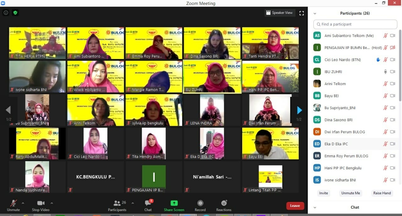 Puji syukur pada tanggal 13 Oktober 2020 telah terselenggara dgn lancar dan sukses kegiatan Pertemuan Rutin IIP BUMN PW Bengkulu secara Virtual Panitia penyelenggara dari BTN dan BULOG bekerjasama dgn Kantor Perwakilan BEI Prov. Bengkulu mengadakan WEBINAR "INVESTASI CERDAS di MASA PANDEMI" Acara di buka oleh MC Ibu Melly dari BTN dan dilanjutkan dgn pembacaan doa oleh Ibu Dwi Irfan dari BULOG.