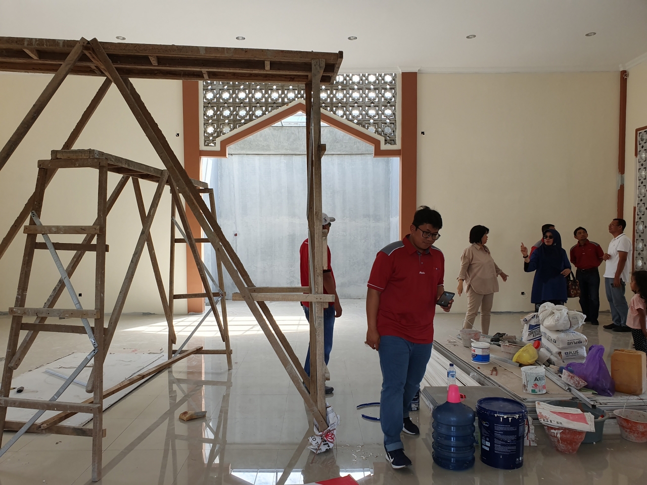 Selain dari melihat progres pembangunan masjid kunjungan kali ini untuk menentukan hal yang berkaitan dengan pengisian masjid diantaranya, karpet, kipas angin, sound sistem, rak buku dan mukena dll. Direncanakan masjid akan diresmikan awal bulan September 2019