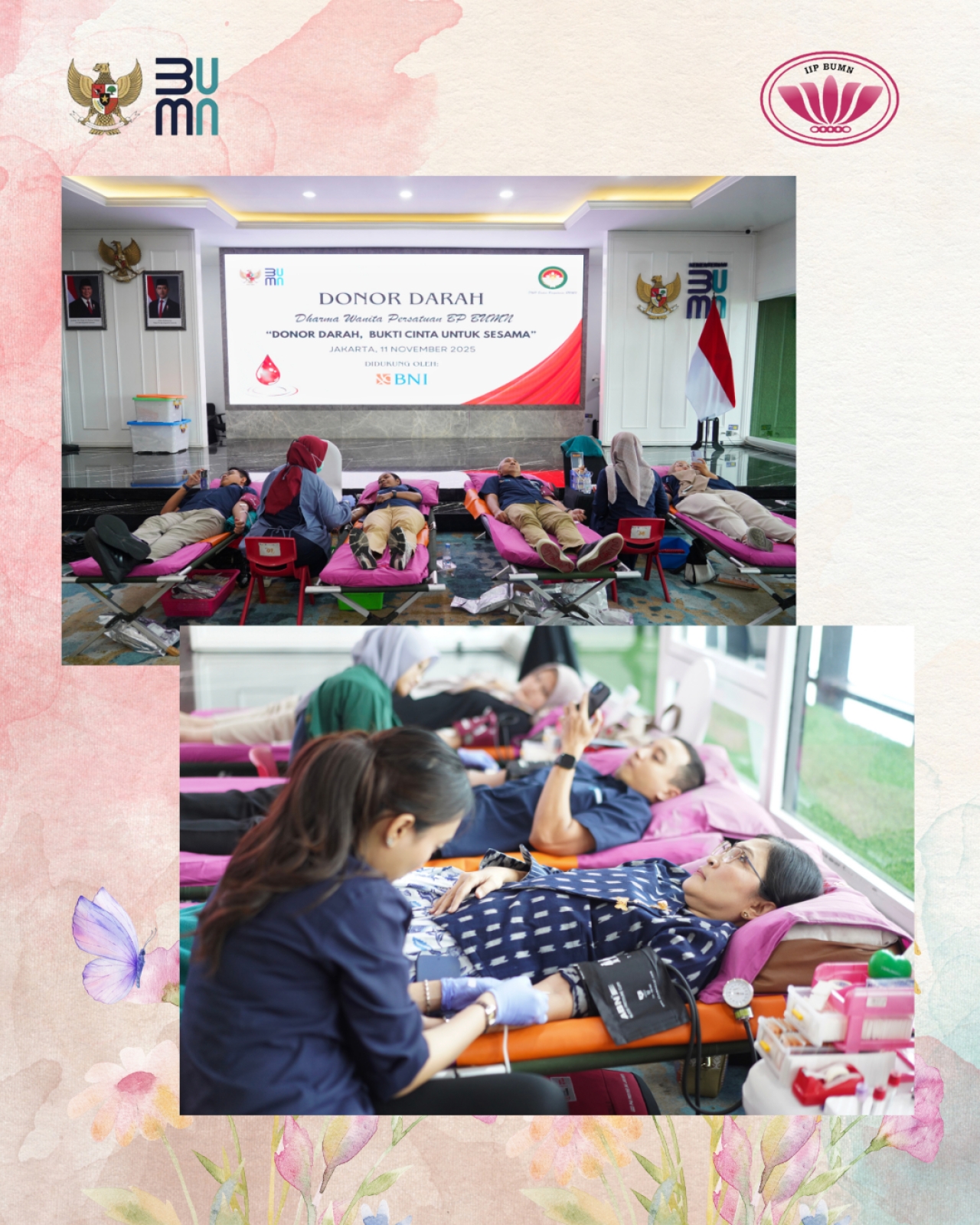 IIP BUMN turut berpartisipasi dalam kegiatan rutin DWP BP BUMN yaitu Donor Darah yang telah terlaksana pada Selasa, 11 November 2025, bertempat di Gedung BP BUMN. Kegiatan tersebut merupakan salah satu Program Kerja Bidang Sosial Budaya DWP BP BUMN yang dilaksanakan secara rutin setiap tahunnya.