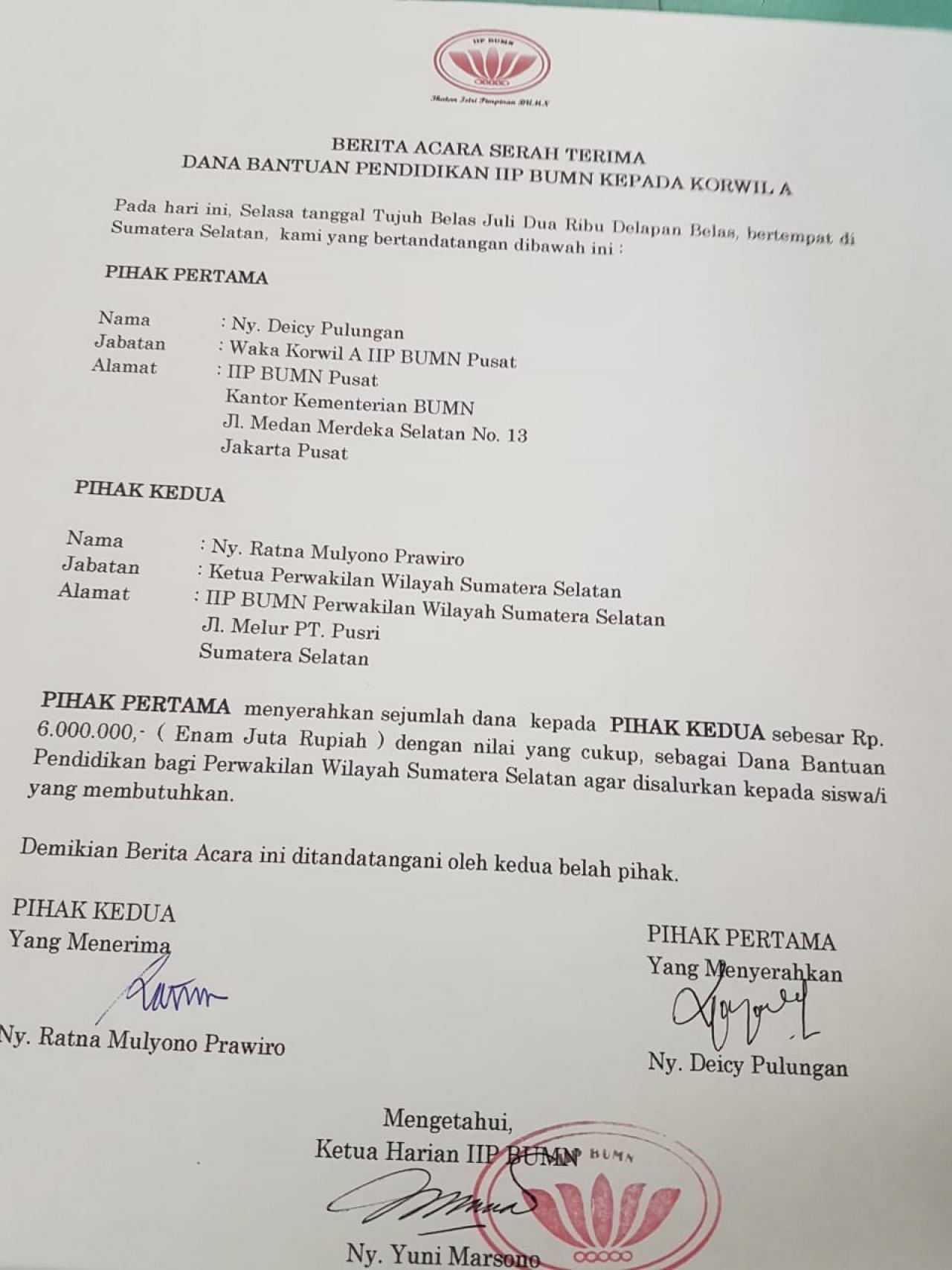 Pada Tanggal 19 Juli 2018 bertempat di Sekretariat IIP BUMN Pusat telah dilakukan penandatangan MOU serah terima bantuan Dana Pendidikan dari IIP BUMN Pusat kepada IIP BUMN Wilayah Sumsel.