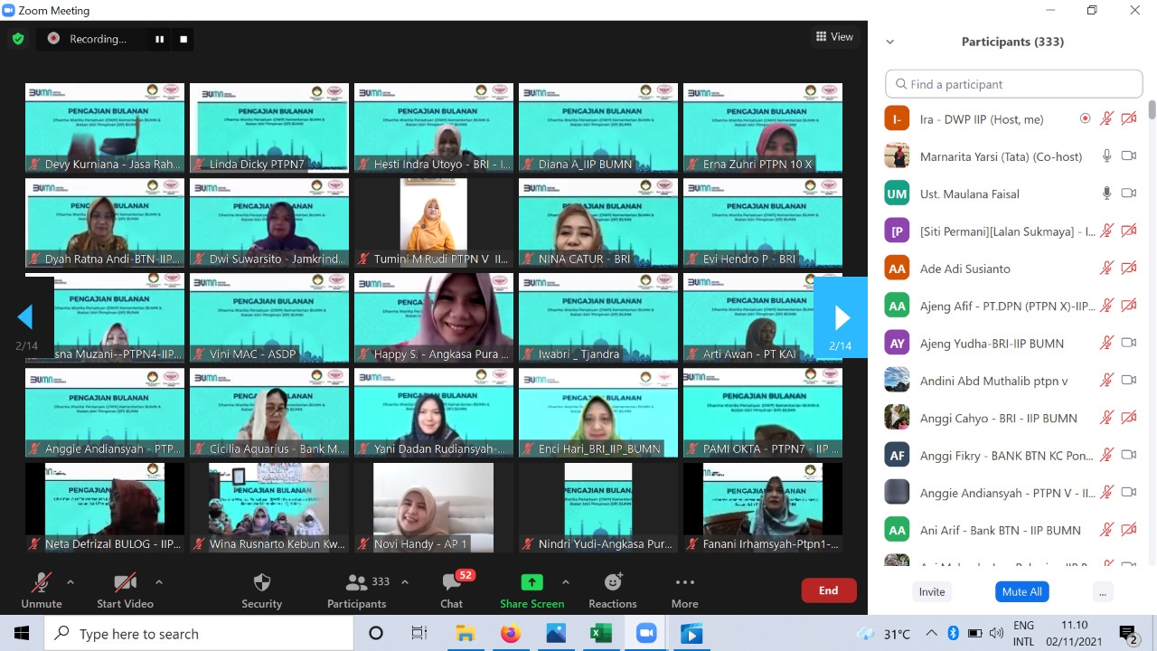 Pengajian rutin ini dihadiri oleh Penasihat DWP Kementerian BUMN sekaligus Wakil Ketua Umum IIP BUMN Ibu Sinta Pahala dan Ibu Irin Kartika, pengurus IIP BUMN Pusat dan Ibu-ibu IIP BUMN dari seluruh Indonesia, dengan jumlah total 364 peserta zoom.