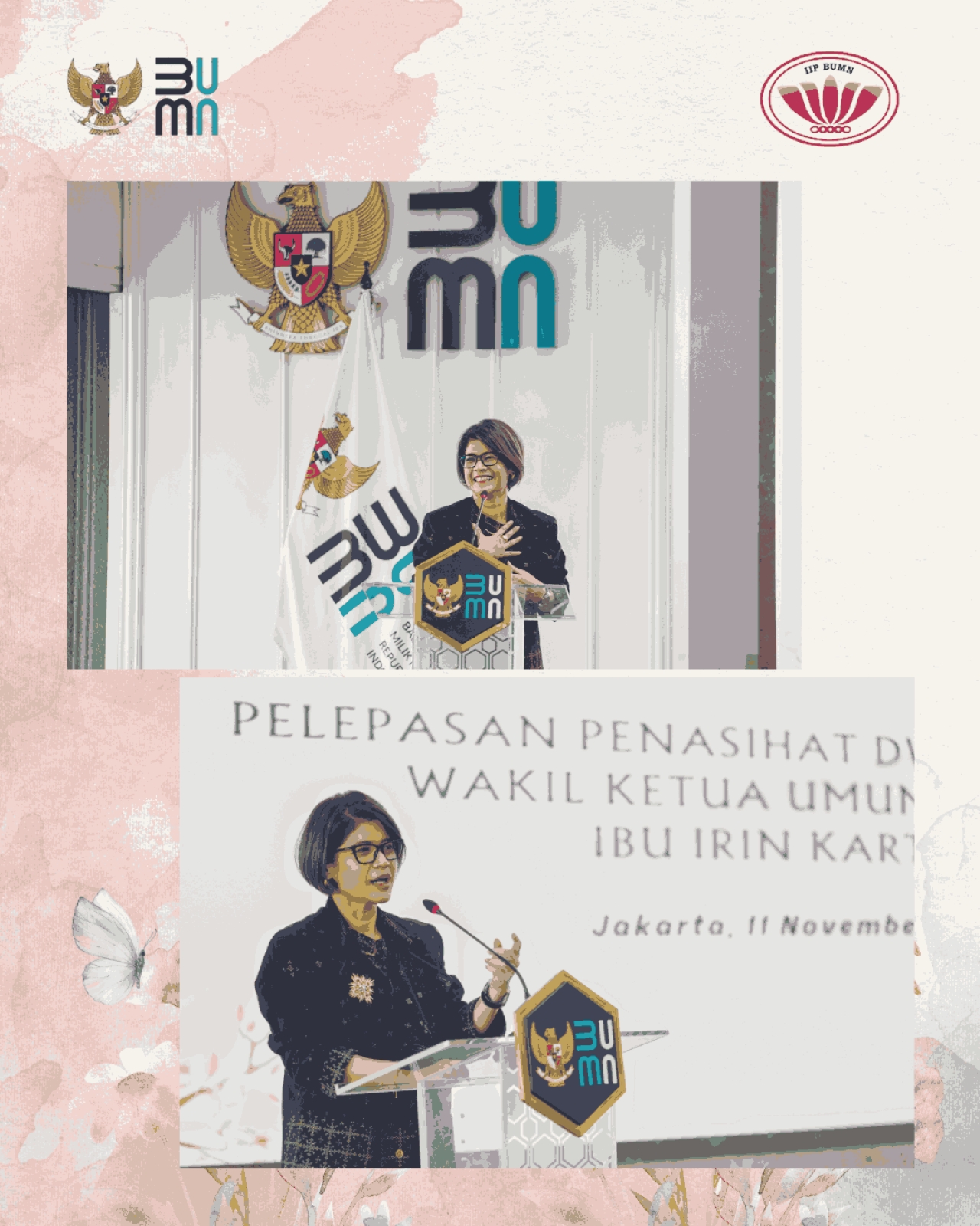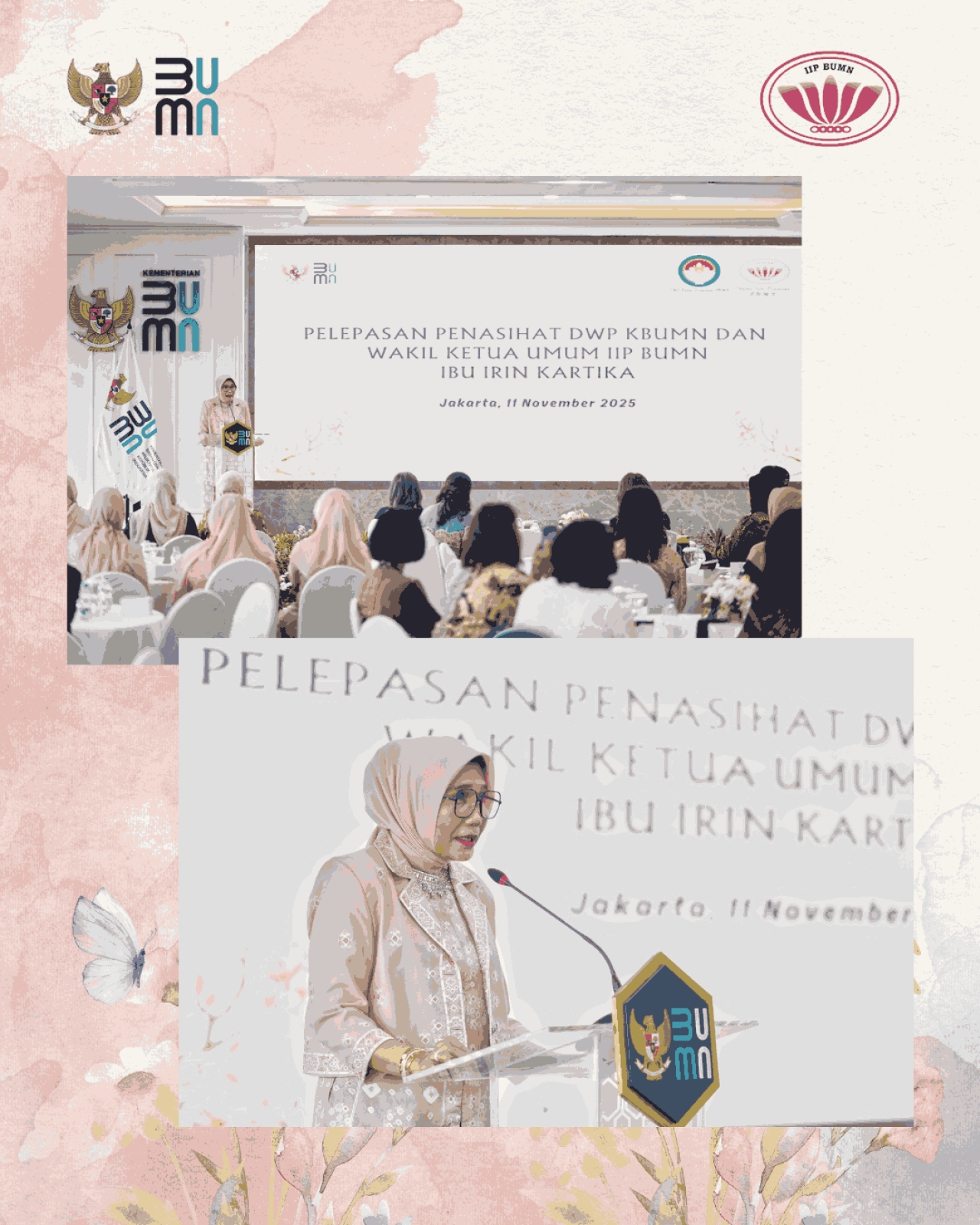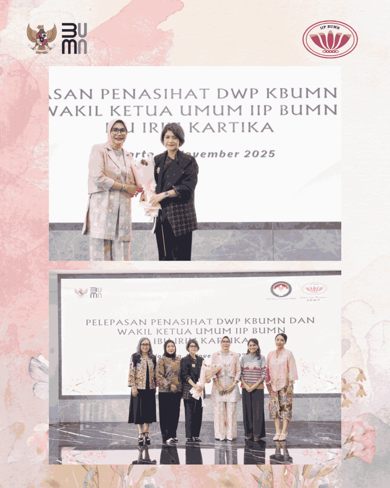 Pada hari Selasa, 11 November 2025 diselenggarakan pelepasan Penasihat DWP BP BUMN dan Wakil Ketua Umum IIP BUMN, Ibu Irin Kartika, yang telah melaksanakan tugas selama 6 tahun.