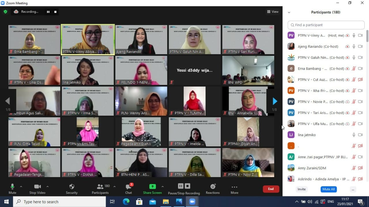 Pekanbaru, pada tanggal 23 Januari 2021 telah terlaksana pertemuan IIP BUMN Wilayah Riau dengan agenda inti acara yaitu seminar online keluarga dengan tema "Menyiapkan Anak-Anak Yang Tangguh Di Era Generasi Z". Kondisi pandemi tidak menyurutkan semangat ibu ibu IIP BUMN Riau untuk tetap bersilaturahmi yang dilakukan secara virtual.