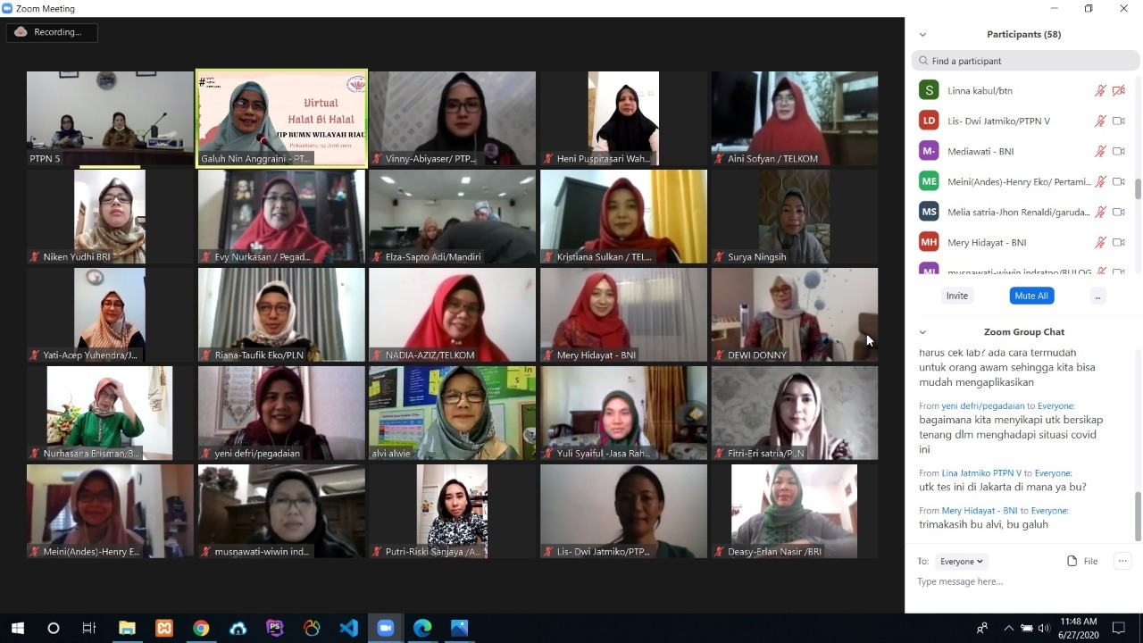 Pekanbaru, pada tanggal 27 Juni 2020 telah dilaksanakan Halalbihalal Virtual IIP BUMN Wilayah Riau dan pertemuan ini dilakukan secara virtual melalui Media Online Zoom Video Conference. Dalam masa Pandemi Covid-19 seperti sekarang ini tidaklah menjadi halangan untuk saling bersilahturahmi walau secara online.