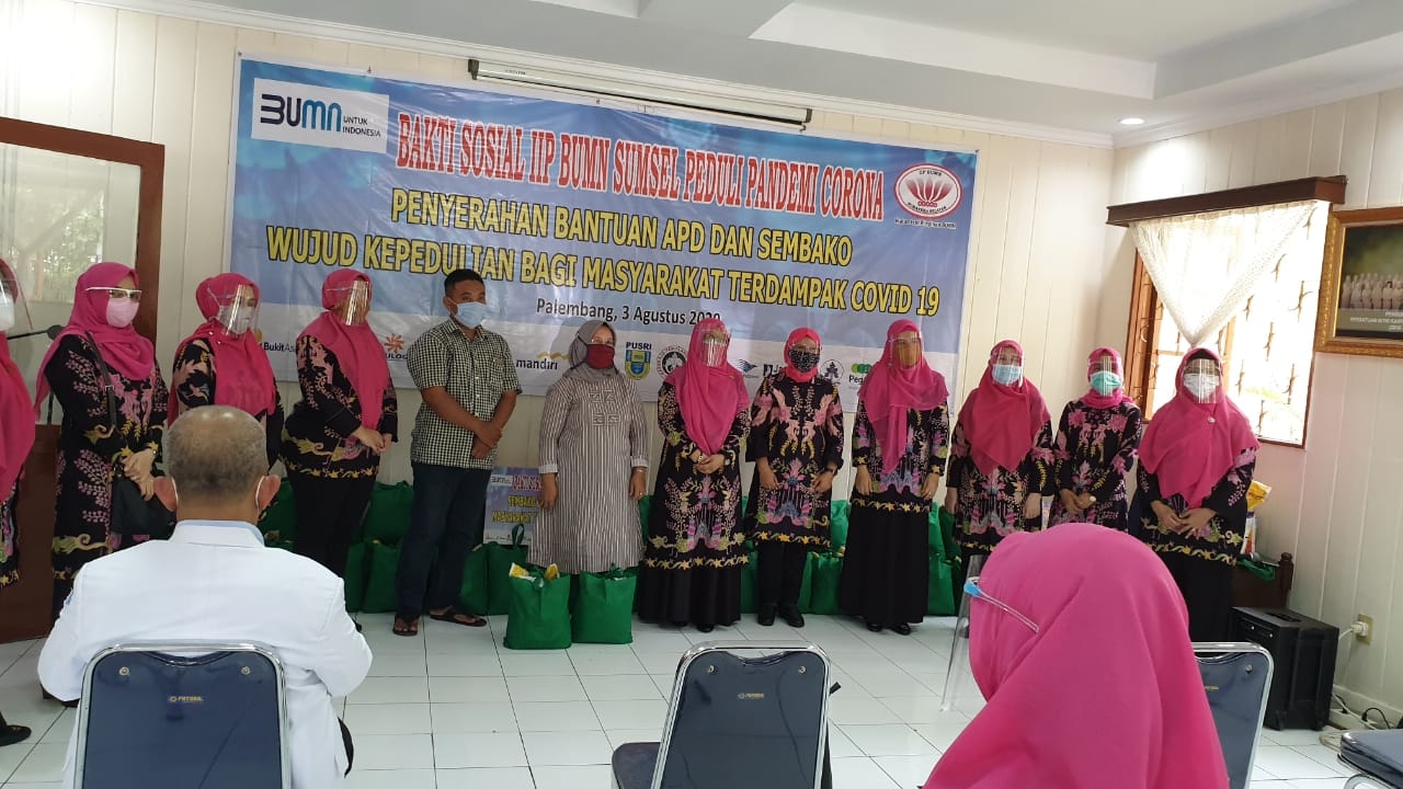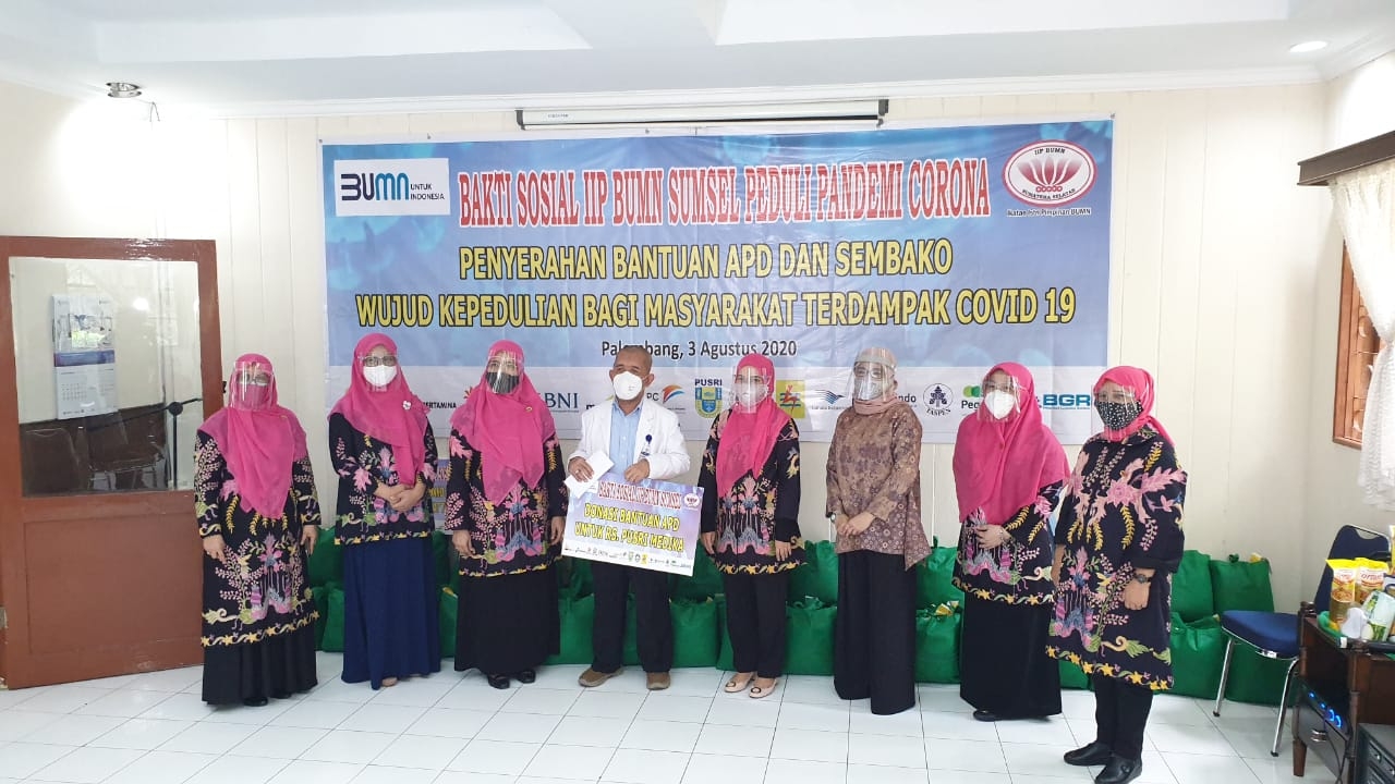 Sebagai wujud kepedulian terhadap masyarakat terdampak wabah Covid-19 di Kota Palembang, Ikatan Istri Pimpinan (IIP) BUMN Sumatera Selatan memberikan bantuan berupa paket sembako dan APD berupa masker, serta donasi untuk pembelian APD kepada RS Pusri Medika bertempat di Sekretariat IIP BUMN Sumsel pada tanggal 3 Agusttus 2020. Acara ini dihadiri oleh pengurus dan anggota IIP BUMN Sumsel dan penerima bantuan.