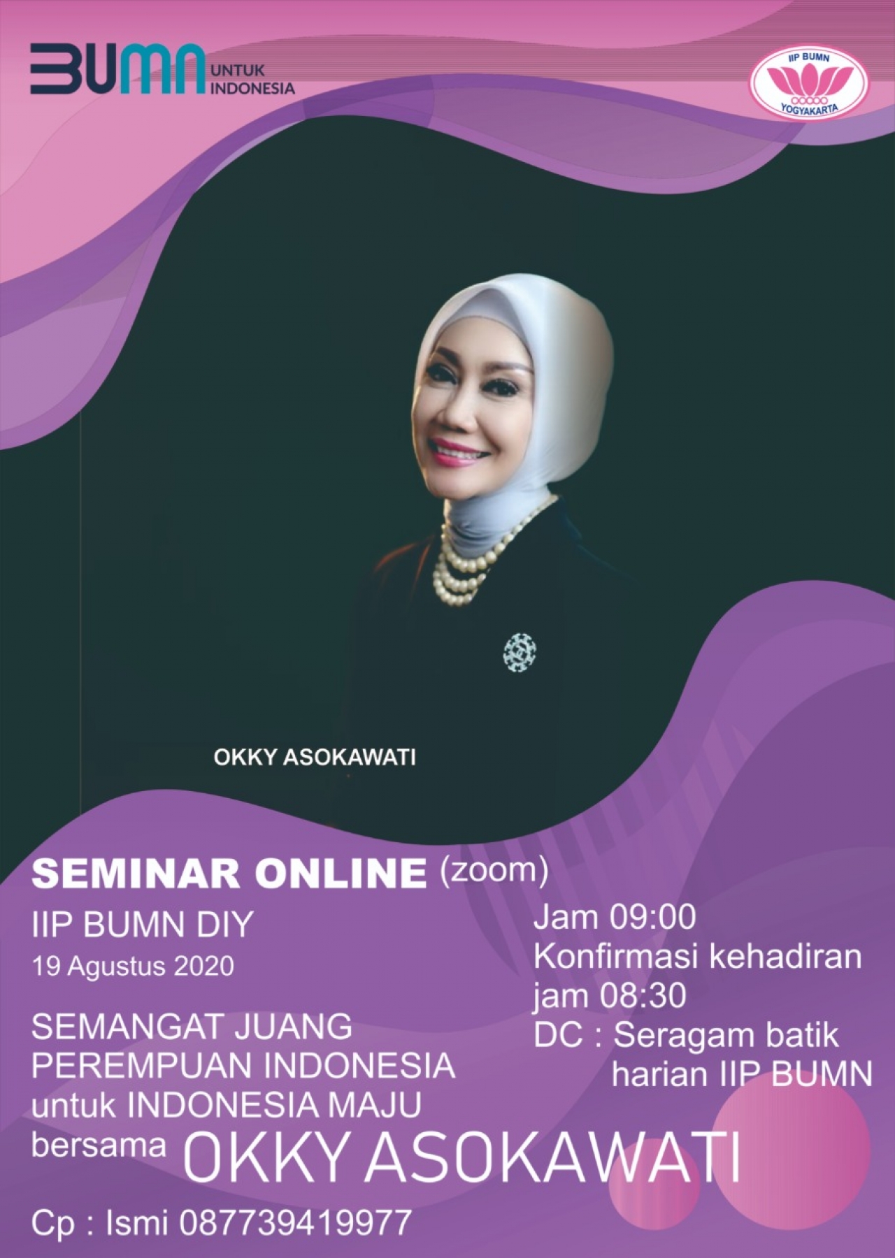 Yogyakarta, 19 Agustus 2020. IIP BUMN DIY menyelenggarakan kegiatan Seminar Online bertajuk Semangat Juang Perempuan Indonesia Untuk Indonesia. Nara sumber dalam seminar ini adalah Dra. Okky Asokawati, M.Si. Seminar ini diikuti oleh keluarga besar IIP BUMN DIY melalui media Zoom. Tujuan dari kegiatan ini salahsatunya adalah guna memberikan motivasi dan inspirasi kepada para perempuan khususnya keluarga IIP BUMN DIY untuk lebih berdayaguna menuju Indonesia Maju.