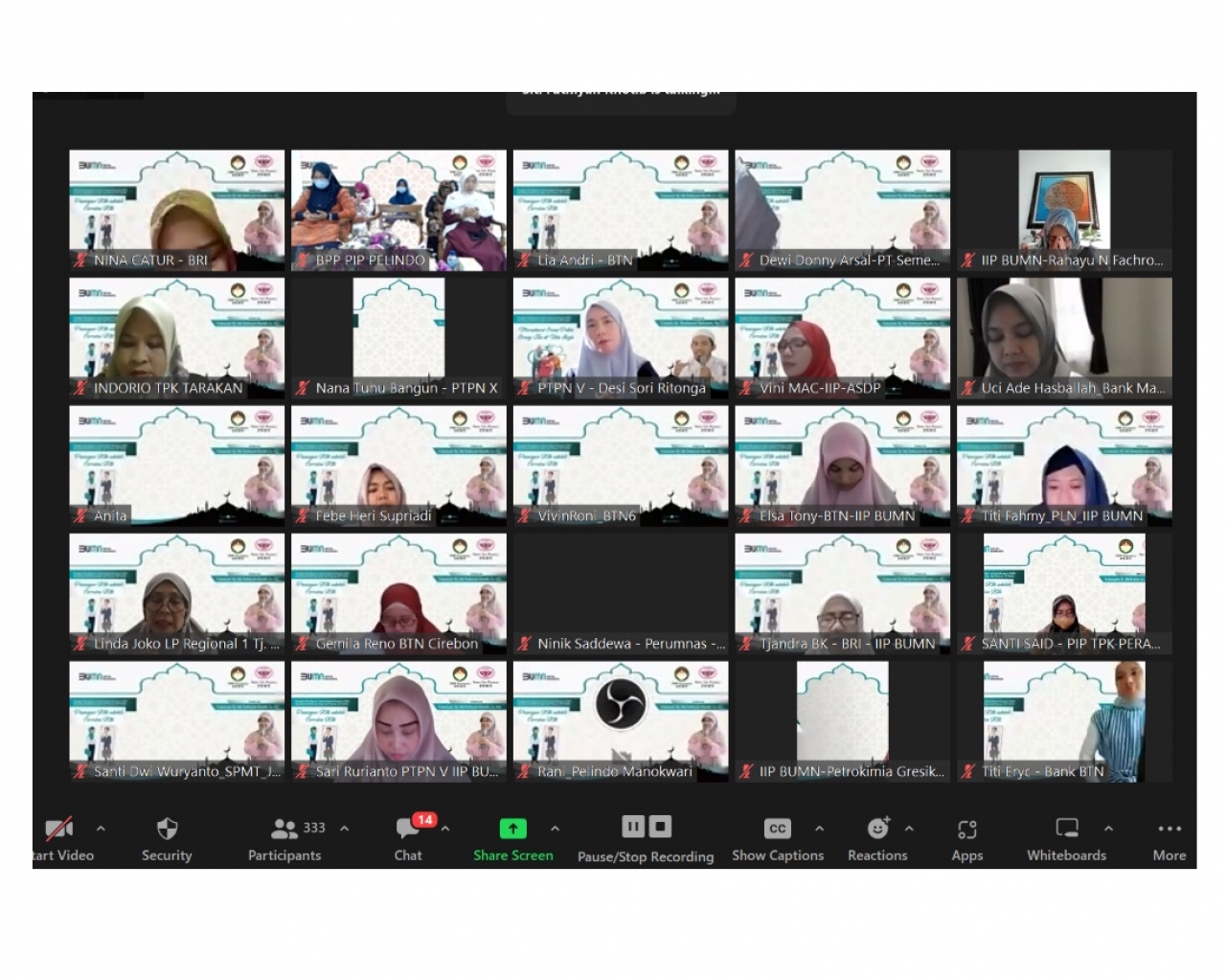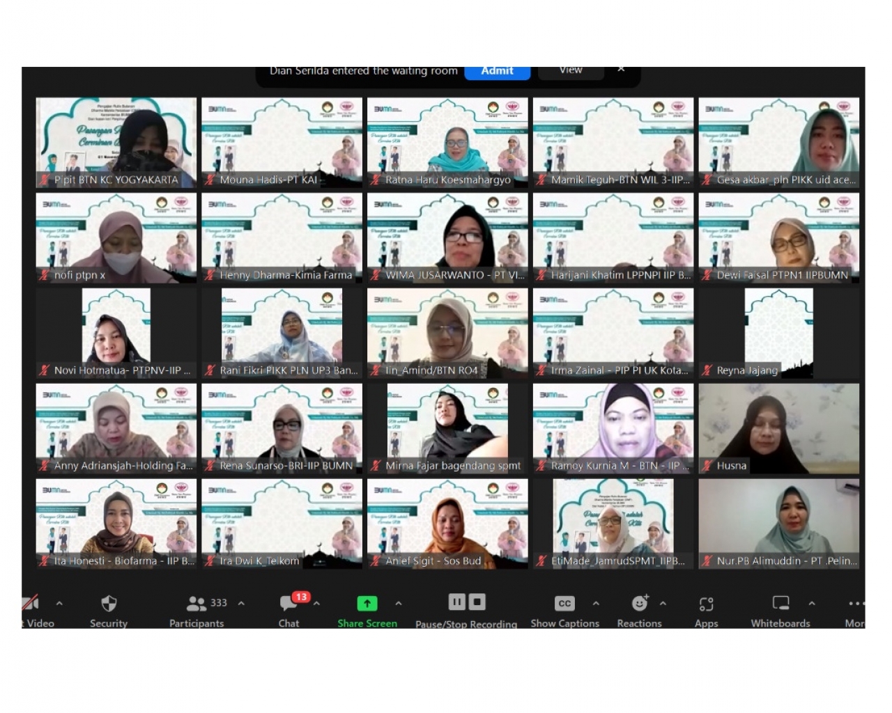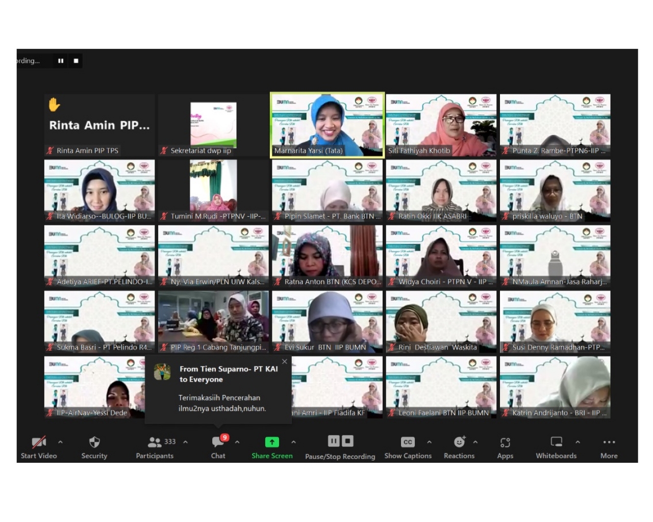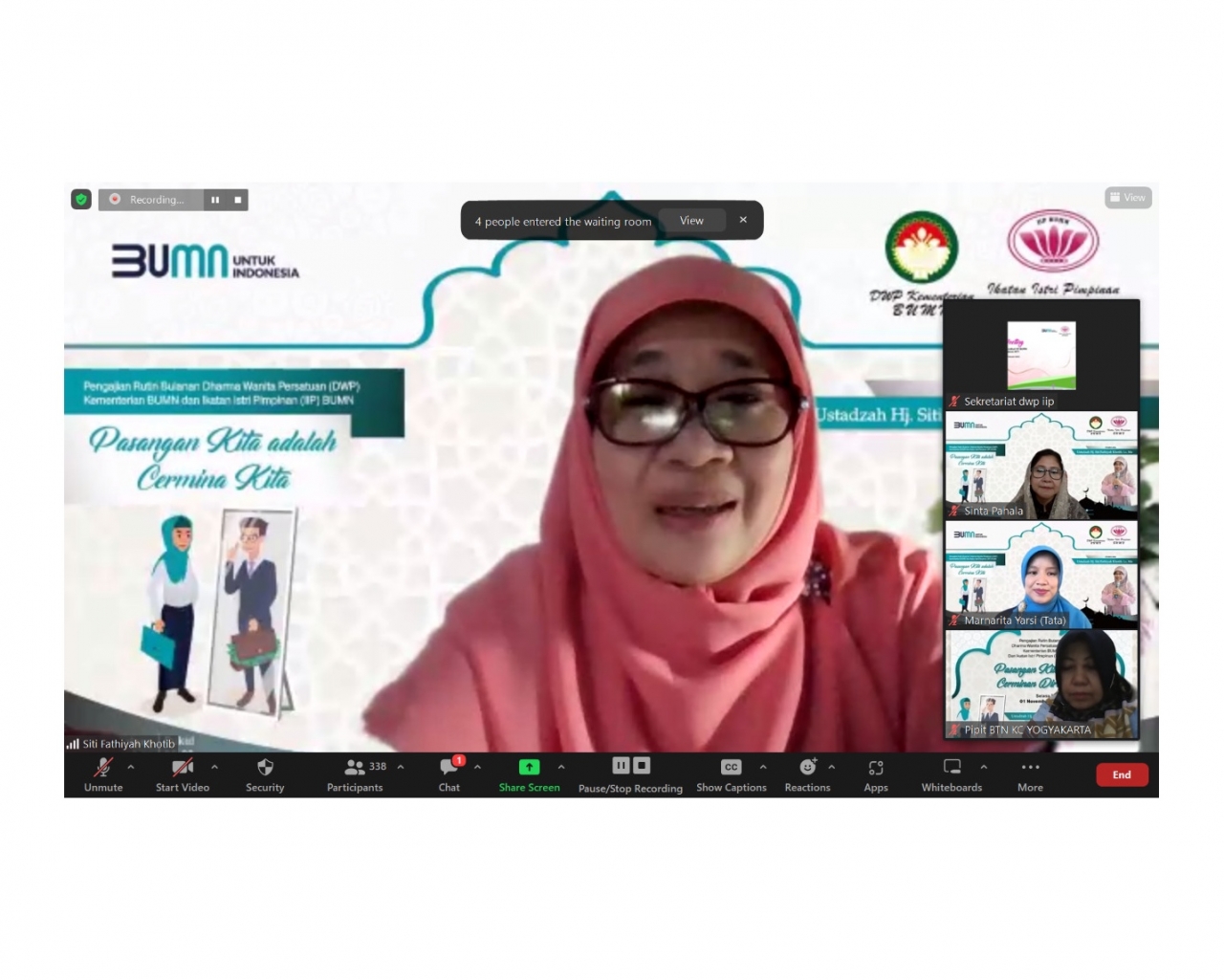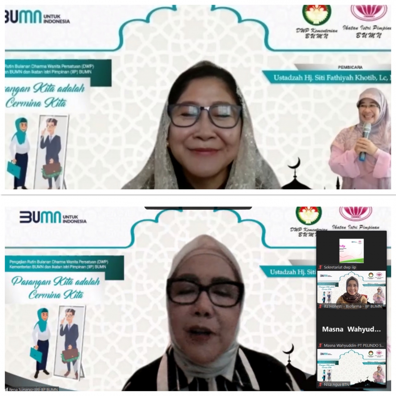 Alhamdulillahi Robbil Alaamin, pada hari Selasa, 1 November 2022 telah dilaksanakan pengajian rutin DWP Kementrian BUMN-IIP BUMN. Penceramah pada pengajian kali ini adalah Ustadzah Hj. Siti Fathiyah Khotib, Lc. MA. Tema yang disampaikan Pasangan Kita Cermin KIta. Pengajian dihadiri Ibu Sinta Pahala (Wakil Ketua Umum IIP BUMN), Ibu Rena Sunarso (Ketua Harian IIP BUMN) dan 364 orang secara zoom.