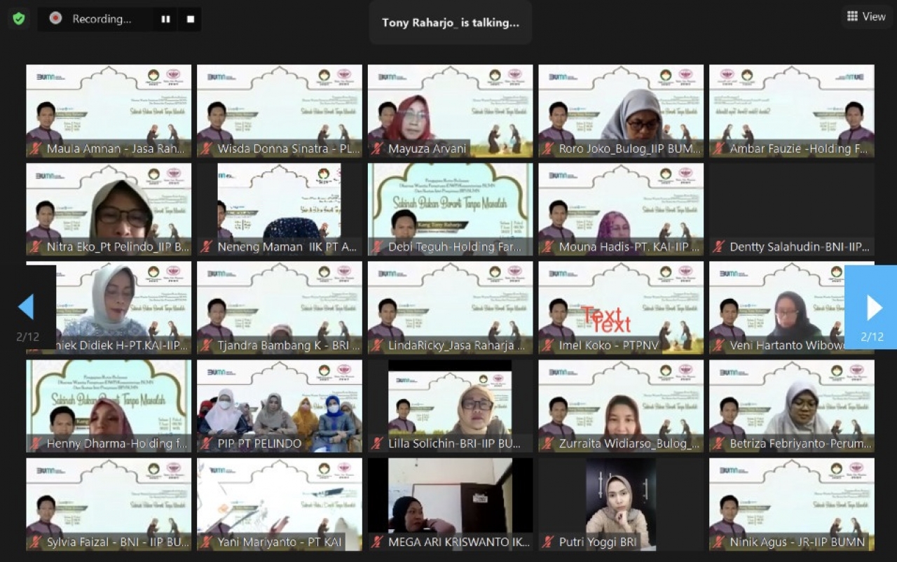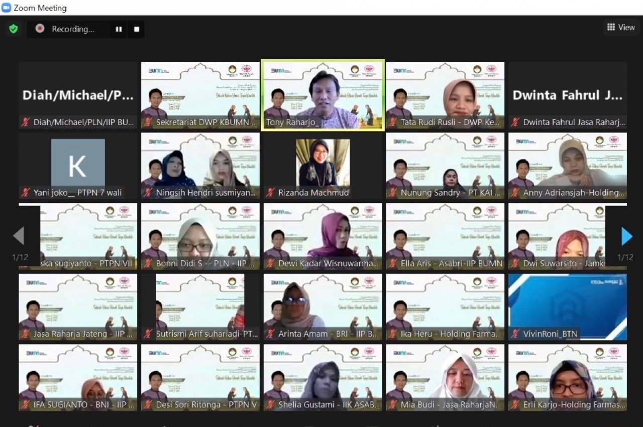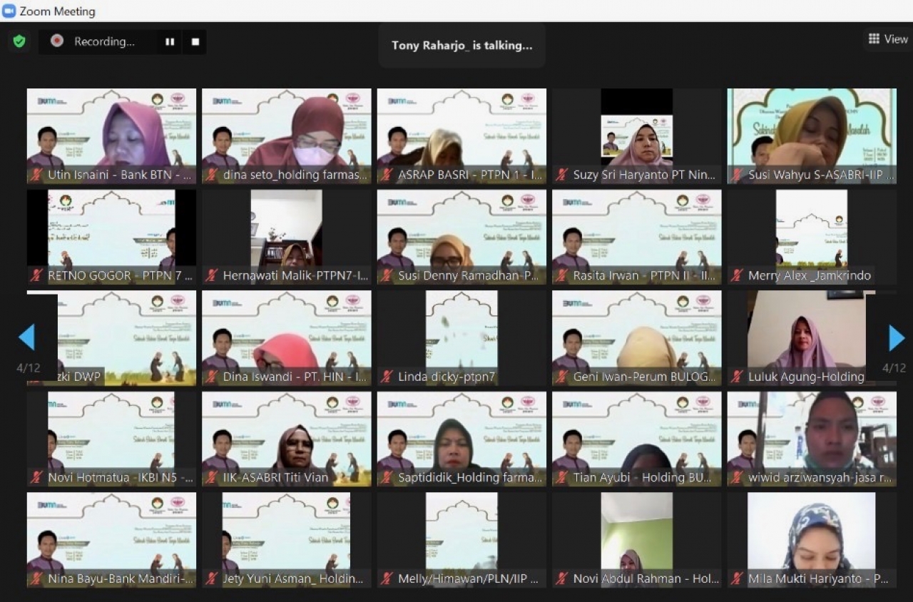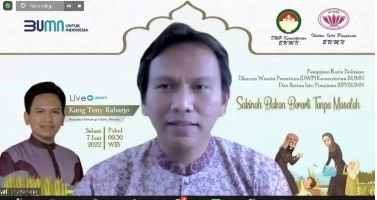 Alhamdulillahi Robbil Alaamin, pada hari Selasa, 7 Juni 2022 telah dilaksanakan pengajian rutin DWP Kementrian BUMN-IIP BUMN. Penceramah pada pengajian kali ini adalah Kang Tony Raharjo, seorang konselor keluarga Islam dan penulis. Tema yang disampaikan Sakinah Bukan Berarti Tanpa Masalah. Pengajian dihadiri 285 orang secara zoom.