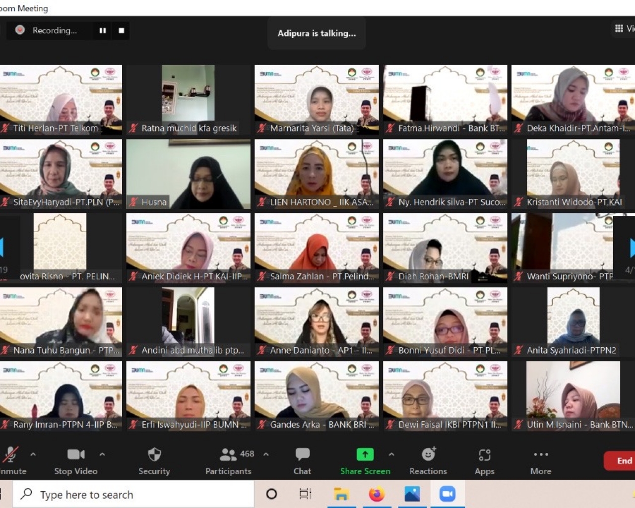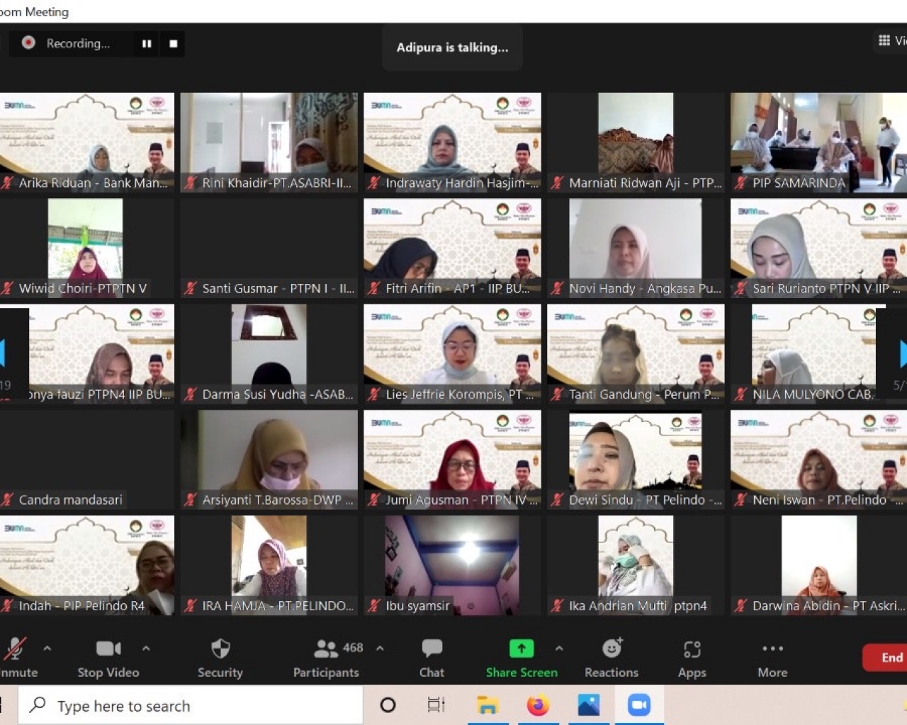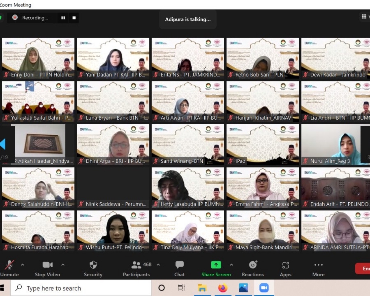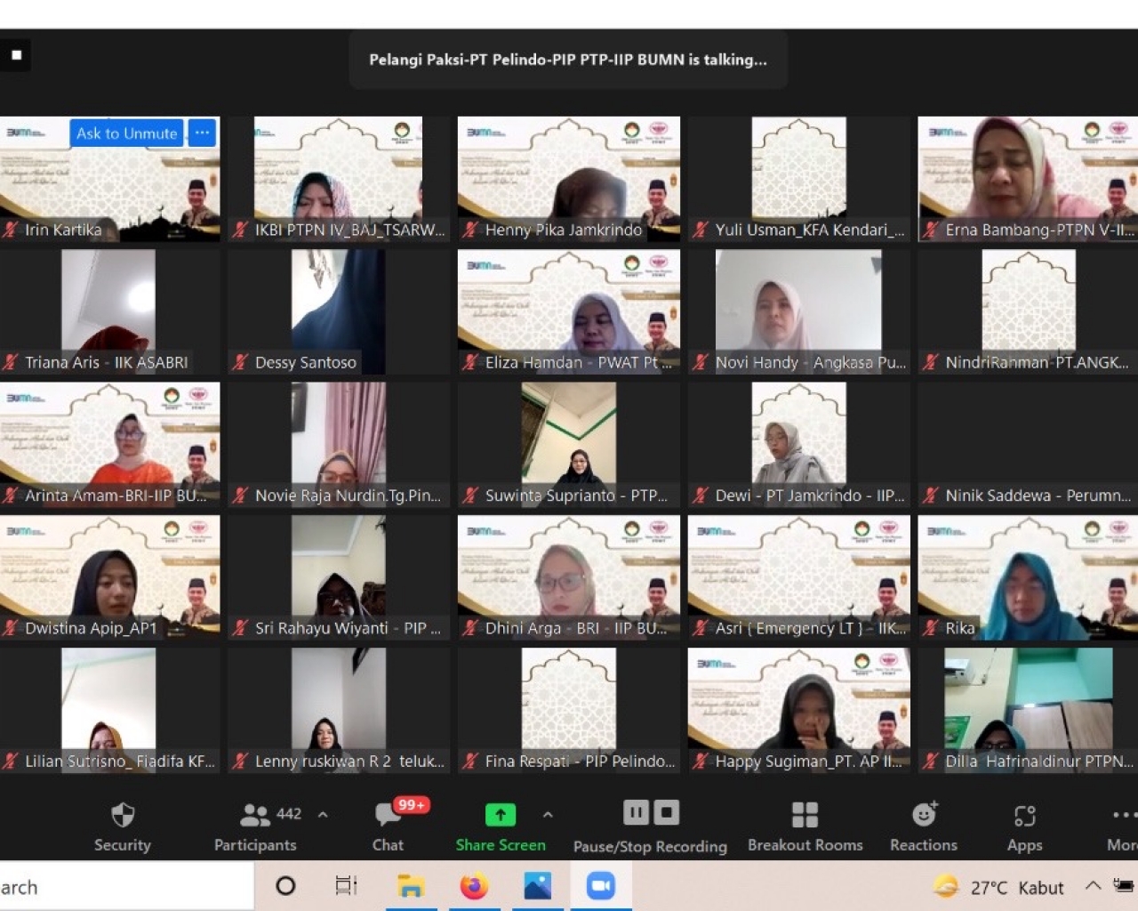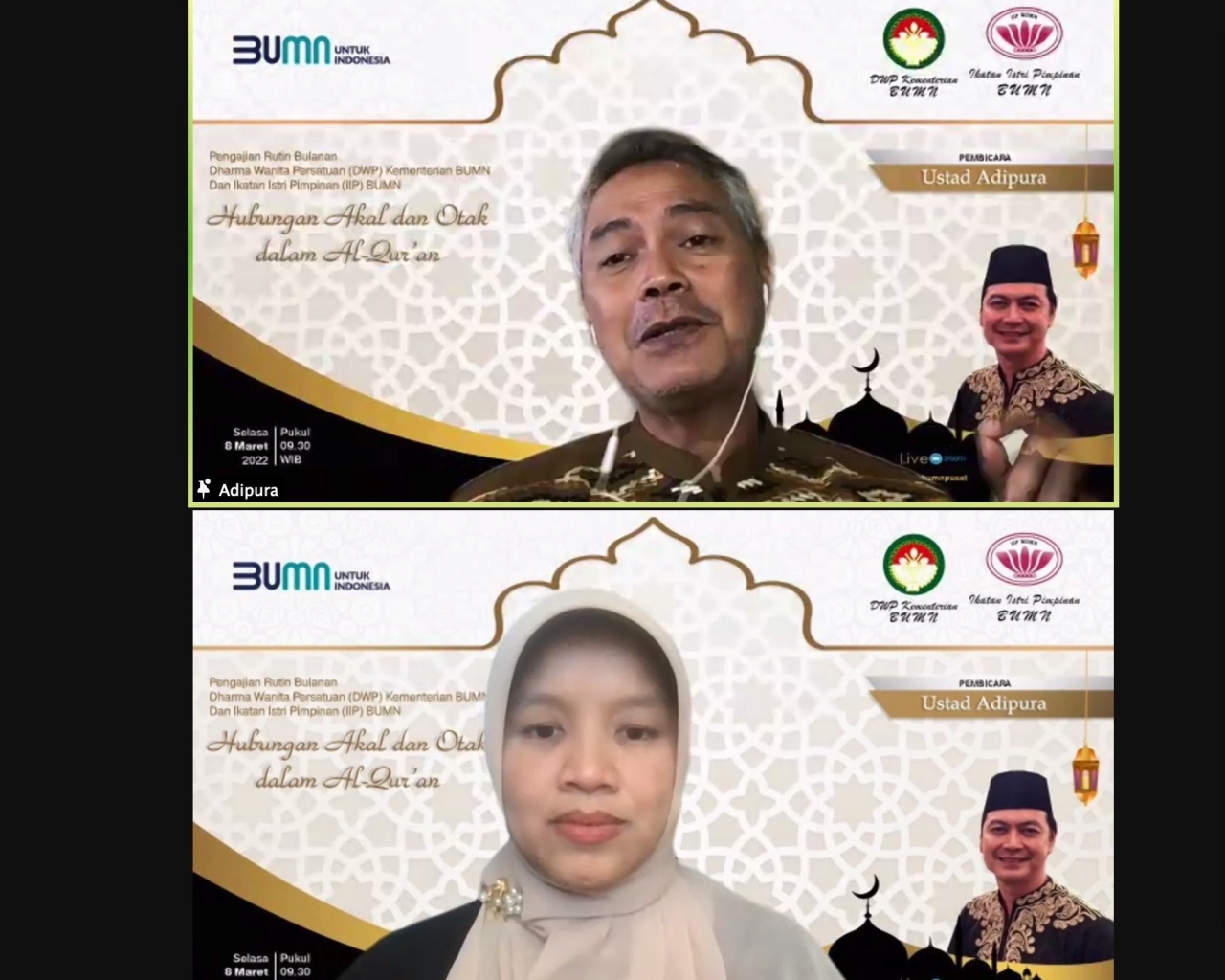 Pengajian dihadiri Ibu Irin Kartika dan Ibu-ibu DWP Kementrian BUMN – IIP BUMN sebanyak 458 peserta, dengan mengundang Ustadz Adipura sebagai penceramah, MC Ibu Tata Rudi Rusli, Qori Ibu Husna Abdul Hadi, dengan membacakan QS. Al Baqarah 30 dan Al Hajj 40. Tema Pengajian : “Hubungan Akal dan Otak dalam Al Quran”.