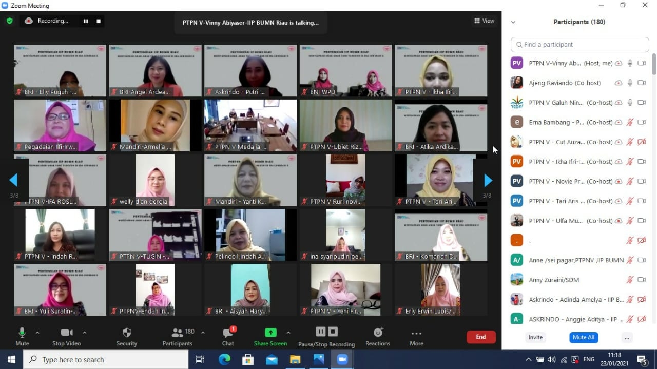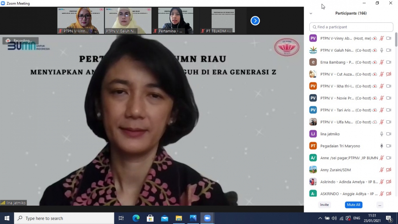 Pekanbaru, pada tanggal 23 Januari 2021 telah terlaksana pertemuan IIP BUMN Wilayah Riau dengan agenda inti acara yaitu seminar online keluarga dengan tema "Menyiapkan Anak-Anak Yang Tangguh Di Era Generasi Z". Kondisi pandemi tidak menyurutkan semangat ibu ibu IIP BUMN Riau untuk tetap bersilaturahmi yang dilakukan secara virtual.